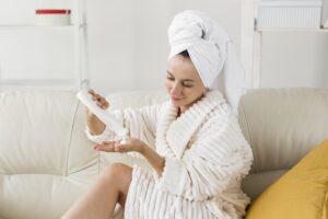 Logo após sair do chuveiro, seque o corpo com a toalha dando leves “apertos”, sem esfregar. A pele ainda levemente úmida é o momento ideal para aplicar loções corporais nutritivas, que ajudam a reter a água dentro da pele.